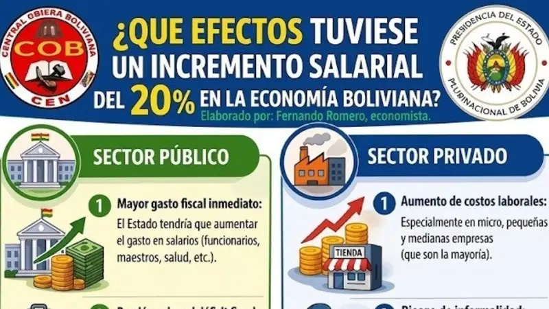 Un incremento del salario mínimo del 20% en Bolivia tendría efectos importantes tanto en el sector público como en el privado. En el caso del Estado, implicaría un aumento inmediato del gasto en sueldos, lo que presionaría aún más el déficit fiscal ya existente. Además, muchos pagos como pensiones y bonos están vinculados al salario mínimo, por lo que también subirían automáticamente. En términos simples, el Estado tendría que gastar más dinero sin necesariamente generar mayores ingresos, lo que puede afectar la sostenibilidad de las finanzas públicas en el mediano plazo.