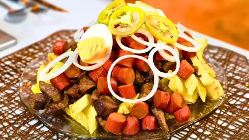 Esta explosiva combinación de papas fritas, carne de res jugosa, chorizo, locoto y condimentos es un ícono de la cocina nacional, famoso por su sabor intenso y su picante inconfundible.