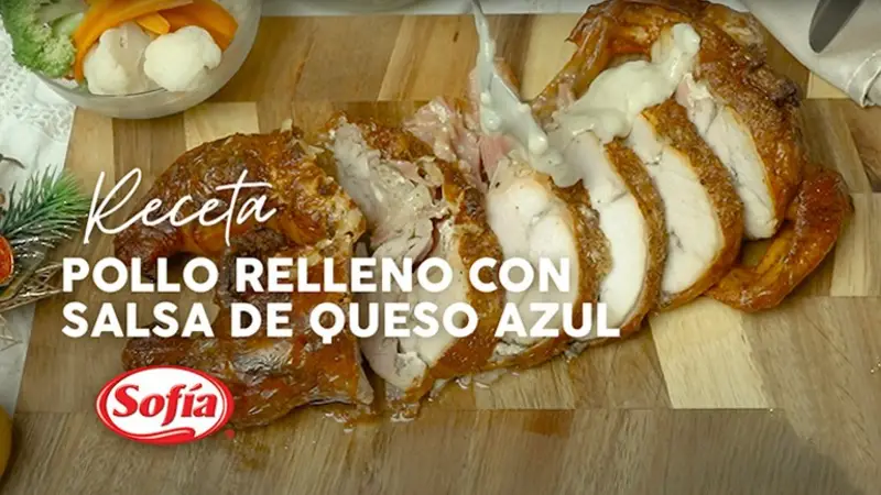 Después de los 40 minutos retiramos el delicioso pollo relleno Yo Chef de Sofía del horno, dejamos reposar 10 minutos para luego servirlo acompañado de nuestra salsa de queso azul, puré de papa y unos vegetales al vapor.