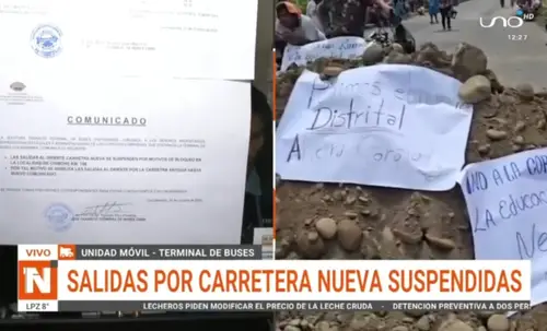 Un bloqueo instalado por padres de familia en el kilómetro 198, sector Chimoré, obligó a suspender completamente los viajes hacia el oriente por la carretera nueva. Las salidas desde la Terminal de Buses de Cochabamba se realizan únicamente por la carretera antigua hasta nuevo aviso.