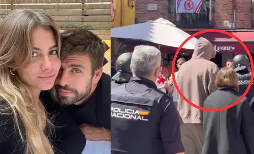 En las imágenes se observa al exfutbolista y su novia saliendo de un restaurante escoltados por policías, mientras que un grupo masivo de personas los abucheaban, recordando la presunta infidelidad de Pique hacía Shakira.