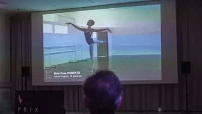Con mascarillas negras, los nueve jueces garabatean notas en sus escritorios mientras ven a la británica Maia Rose Roberts, de 16 años, realizar una clase de ballet sola.