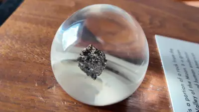 El origen de esta pieza se remonta a diciembre de 1972, cuando la NASA llevó banderas de distintos países hasta la Luna. A su regreso, cada nación recibió su insignia junto a un diminuto fragmento lunar como símbolo de ese logro compartido.