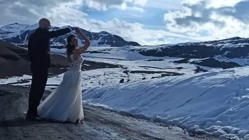 A pesar del frío y la dificultad de movilizarse, las sonrisas y el amor estuvieron presentes todo el momento. Así, la pareja pudo retratar su unión a 4700 metros de altitud.