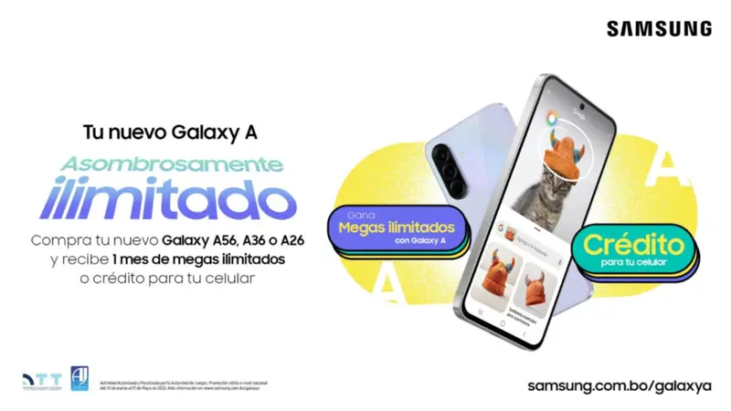 Con la llegada a Bolivia de la nueva serie A, Samsung impulsa su nueva campaña "Asombrosamente Ilimitado", con la cual los usuarios que adquieran un Galaxy A56, Galaxy A36 o Galaxy A26 podrán elegir entre un mes de megas ilimitados o Bs 150 de crédito en su celular, permitiéndoles aprovechar la conectividad y las funciones avanzadas de inteligencia artificial (IA) en su nuevo dispositivo.