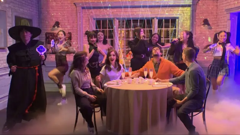 En la escena, Thomas es invadido por una fantasía musical en la que junto a sus compañeros de mesa aparecen las propias voces de HUNTR/X (Ejae, Rei Ami y Audrey Nuna), quienes irrumpen cantando fragmentos de su éxito "Golden" y "Knock Out".