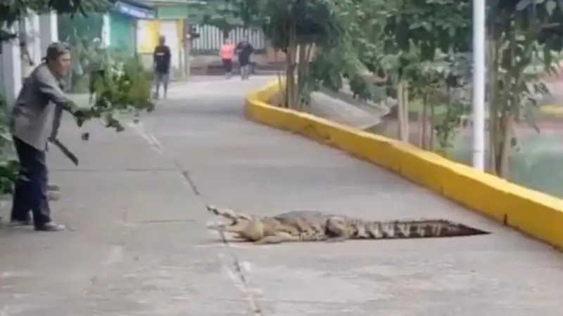 En Ciudad Isla, México, un hombre sorprendió a todos al usar una rama para guiar de vuelta al agua a un cocodrilo que deambulaba por la calle, en un hecho que quedó registrado en video y se viralizó en redes.