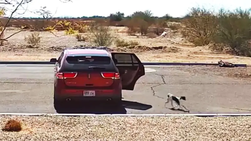 Un conmovedor caso de abandono animal quedó registrado en una carretera de Arizona, Estados Unidos. En las imágenes captadas por cámaras de seguridad, se observa cómo un auto rojo se detiene en la vía, la puerta trasera se abre y un pequeño perro es dejado en el asfalto.