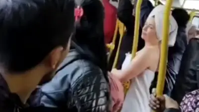 Una mujer causó sorpresa en Colombia al viajar en transporte público cubierta solo con toallas.