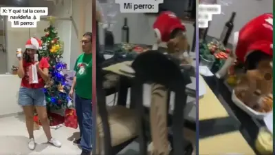 Los hijos mostraban los obsequios recibidos y sacaban fotografías, hasta que de repente escuchar un ruido extraño, y cuando voltean a ver lo que pasaba, notaron que era su perro Draco de la raza Beagle, se devoraba el pavo que prepararon.