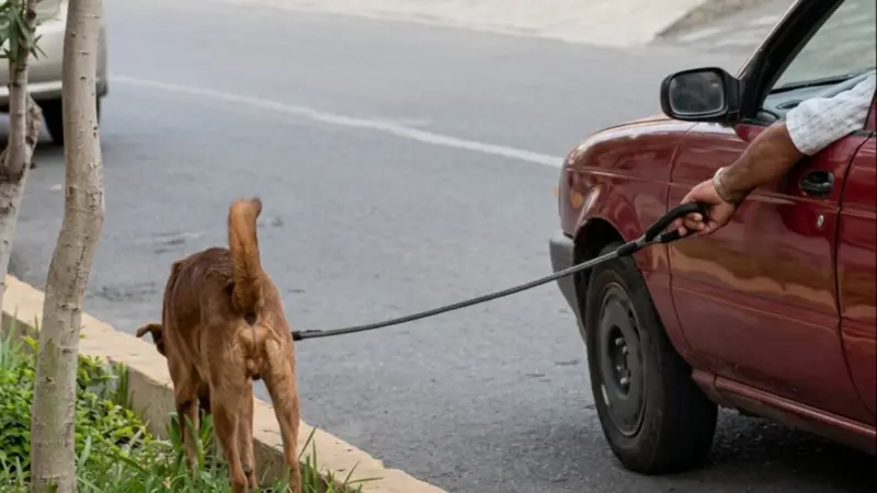 En las imágenes se observa perro caminando con normalidad y disfrutando del recorrido, mientras su dueño lo sigue desde su coche.