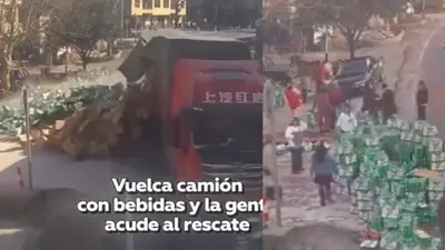 Un camión de carga, que transportaba miles de paquetes de bebidas, perdió el control y volcó de costado, provocando que gran parte de su mercancía quedara esparcida sobre la calzada y la berma, el hecho se suscitó en China.