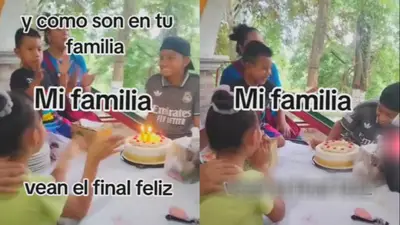 En las imágenes se observa que la familia está cantando por el cumpleaños de un niño que celebraba 11 años. El festejado sopló las velas e inmediatamente todos gritaron: "Mordida".