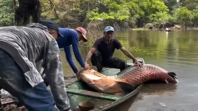 Un pescador local de Brasil sorprendió a toda su comunidad al atrapar un gigantesco pirarucú de 150 kilogramos, un ejemplar excepcionalmente raro por su tamaño y ser escaso. La captura fue registrada en video por uno de sus compañeros, dejando constancia de la magnitud del suceso.