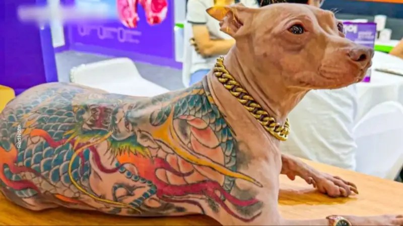 Un video viral mostró a un perro sin pelo cubierto de tatuajes en una feria en Shanghái, desatando críticas y cuestionamientos sobre el bienestar animal.