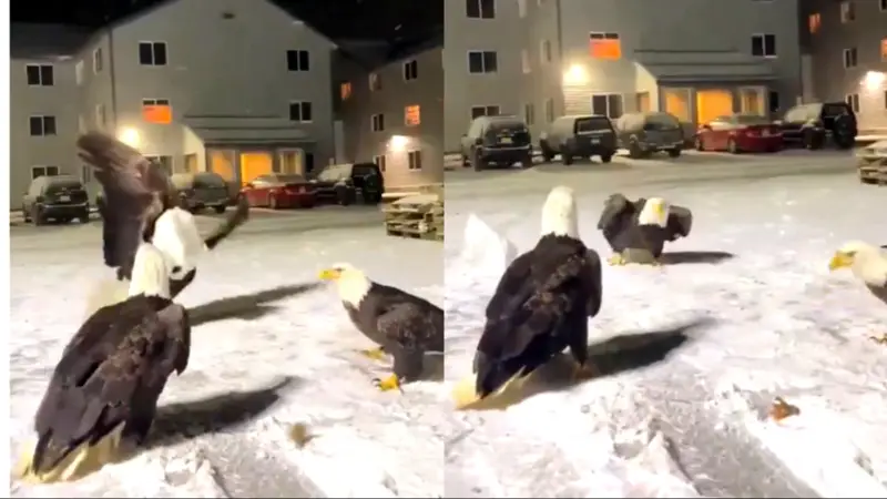 Una escena insólita protagonizada por un grupo de águilas está dando la vuelta al mundo. En el video, se observa a tres aves rapaces reunidas alrededor de lo que parece ser alimento humano desechado. Una de ellas, movida por la curiosidad o el hambre, introduce la cabeza en una bolsa plástica en busca de comida, pero queda atascada durante unos segundos.