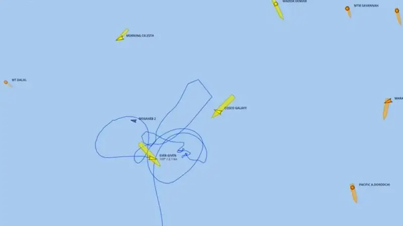 El dibujo de la ruta que siguió el barco, mientras esperaba su turno para atravesar el canal, dibuja una forma obscena . Y este hecho no ha pasado desapercibido, y ha hecho dudar de la profesionalidad de su tripulación, que momentos después bloqueaba una de los canales más importantes para las rutas comerciales del planeta.