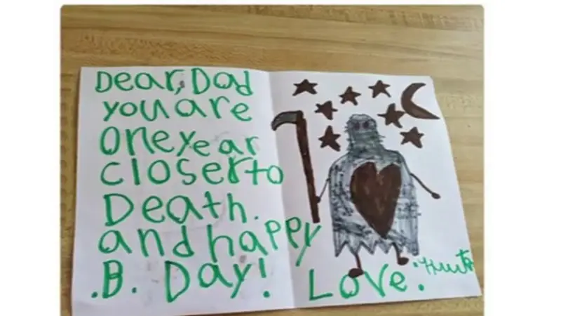 "Querido papá, estás un año más cerca de la muerte. Feliz cumpleaños. Con amor, tu hija", dice la carta de felicitaciones de la niña.