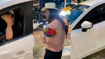 Mientras todo era grabado, el personaje del "patrón" se aproximaba para entregar las flores, la joven de nombre "Mariana" subió su ventana y se negaba a salir de su vehículo para recibir el presenta.