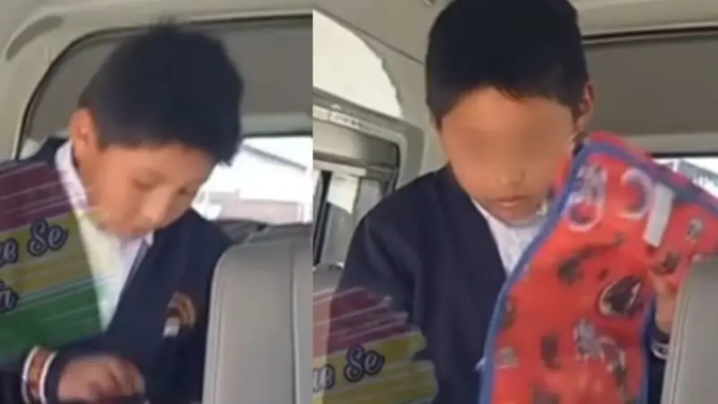 En las imágenes se observa a un pequeño de siete años aproximadamente, con el rostro preocupado, buscando algo entre sus pertenencias dentro de su mochila.