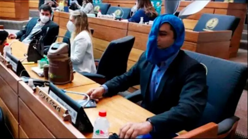 Fiel a su estilo, el diputado altoparanaense Jorge Brítez, llegó a sesionar a la Cámara baja con un calzoncillo puesto en la cabeza y antes de comenzar la reunión, el protagonista del insólito hecho subió una foto a sus redes sociales explicando que él mismo había elaborado su propio “cubrebocas”.