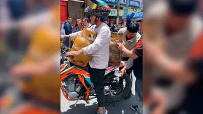 En el video, que circula ampliamente en distintas plataformas, se observa al joven —quien sí llevaba casco de seguridad— transportando una garrafa en la parte delantera de la motocicleta y otra en el asiento del pasajero. Para evitar que se movieran, sus amigos lo ayudaron a asegurarlas envolviéndolo con cinta adhesiva alrededor del cuerpo.