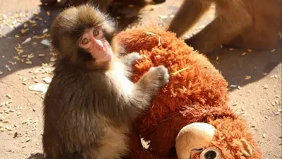 Un pequeño macaco japonés abandonado al nacer en el zoológico de la ciudad de Ichikawa no se separa de un peluche que se ha convertido en una madre improvisada. EFE/ Zoológico De La Ciudad Japonesa De Ichikawa
