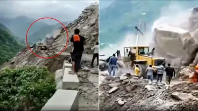 Las lluvias que azotan a India provocaron el desplome de tierra y el desprendimiento de grandes rocas, una de ellas cayó encima de una maquinaria pesada y estuvo a punto de aplastar a los trabajadores de la India.