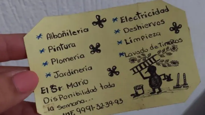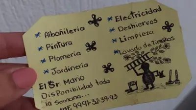 Conocido como 'El Señor Mario', el hombre realiza trabajos en la zona de Ciudad Caucel, en el peculiar volante hecho a mano señala que puede realizar trabajos de albañilería, electricidad, pintura, plomería, jardinería, limpieza, deshierbo y lavado de tinacos.