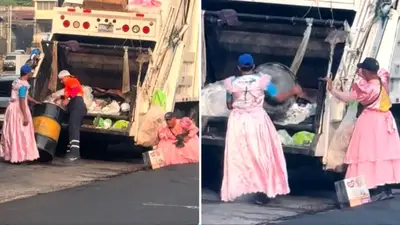 En las imágenes, se ve al grupo de hombres realizando sus labores cotidianas de recolección de basura vestidos con llamativos trajes "estilo princesa" y de color rosado.