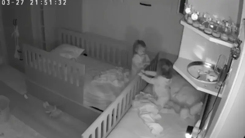 En las imágenes, grabadas en plena noche, se observa a las niñas despiertas dentro de sus cunas. Lejos de dormir, ambas están de pie, jugando y acercándose para compartir un momento de complicidad en la oscuridad.