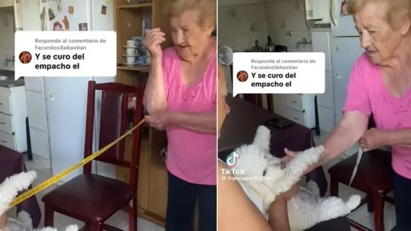 El joven, sorprendido al ingresar a la casa y encontrarse con la escena, registró el momento y lo publicó en TikTok, donde rápidamente se volvió viral. En las imágenes, la mascota permanece tranquila sobre el regazo de otra mujer mientras la abuela realiza los clásicos movimientos con una cinta.
