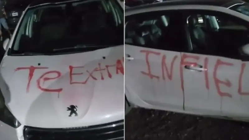Entre disfraces y calabazas, los presentes quedaron impactados al ver el vehículo cubierto de mensajes pintados en rojo y blanco, como “Te extraño, infiel”, en plena madrugada del 1° de noviembre. Según Canal 13 San Juan, el hecho ocurrió en el estacionamiento de un boliche ubicado en el Médano de Oro, el cual fue clausurado esa misma noche tras un operativo policial.
