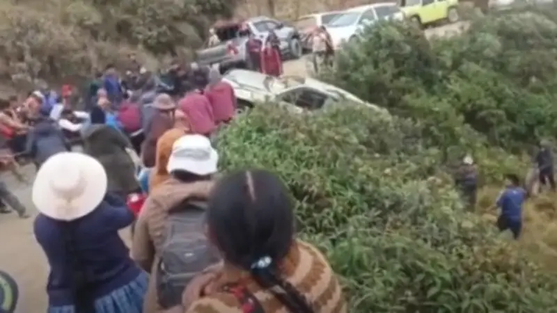 Un video que se volvió viral en redes sociales muestra cómo un grupo de personas logró rescatar un automóvil embarrancado en una carretera de Los Yungas, La Paz, usando únicamente cuerdas y trabajo en equipo.