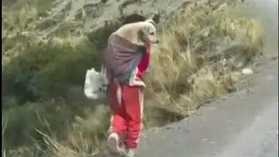 En el video, grabado presuntamente en el occidente del país, se observa a la menor caminando por una carretera con su mascota cargada en un aguayo en la espalda, protegiéndola del cansancio y del frío mientras continúa su camino.