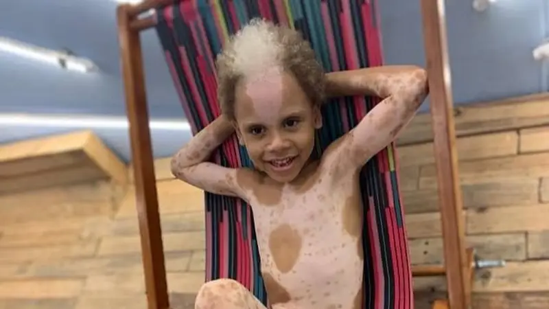 Samuel Silva, de 7 años, de Bahía, Brasil , nació con piebaldismo, una rara condición genética que causa parches de piel y cabello blancos debido a la falta de melanina.
