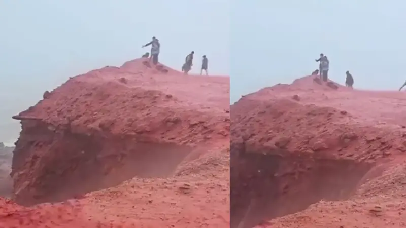 El impactante fenómeno ha dejado a todos sorprendidos, y ha desatado teorías sobre posibles presagios. Las imágenes, captadas en la isla de Ormuz, muestran cómo después de una fuerte lluvia, un torrente de agua roja baja por las montañas y llega hasta la playa, tiñendo la arena con un tono rojo intenso.