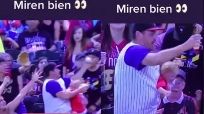 Todo está normal hasta que un hombre se encontraba sosteniendo a su hija con la mano izquierda y la suelta por unas fracciones de segundos para poder atrapar la pelota en el aire y volver a sostener a su hija, sin que esta se cayera al suelo, y sin derramar una sola gota de cerveza que tenía en la mano derecha.