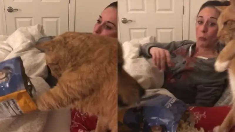 Cuando Roo se dispuso a meter una pata dentro de la bolsa, Bailey se abalanzó contra él y lo apartó de la comida. La reacción del gatito, fue inesperado por la aparición del perro en la escena y la cara de sorpresa de la mujer que aparece detrás hizo que el breve video causara sensación en TikTok.