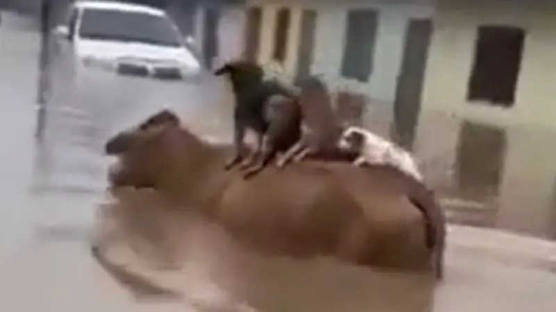 Durante las graves inundaciones que afectan al departamento de Córdoba, en el Caribe colombiano, una vaca se convirtió en el inesperado “salvavidas” de varios perros y gatos que luchaban por no ser arrastrados por la corriente.