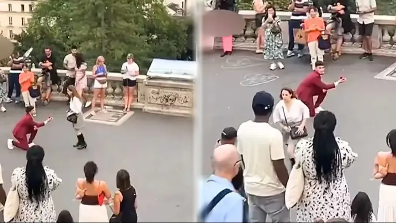 Fue una tarde soleada en la Basílica del Sacré-Cœur de Montmartre, París, cuando un joven decidido a sorprender a su novia con una propuesta de matrimonio romántica se encontró con una respuesta que cambiaría su vida de manera inesperada. Ataviado con un traje color guindo y arropado por una multitud que se congregaba en uno de los lugares más emblemáticos de la ciudad, el hombre se arrodilló para ofrecerle un anillo de compromiso a su pareja.