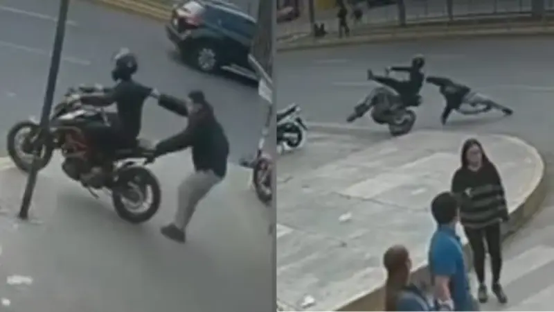 Como se vio en un clip viral de Latina Noticias, el muchacho no se quedó parado, y decidió correr detrás de su atacante. Bastaron solo unos metros para que el joven se subiera a la motocicleta y luego lo derribara al piso.