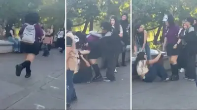 En las imágenes se observa a la joven —señalada en redes como supuesta “therian”— correr entre las personas hasta acercarse a otra mujer que se encontraba sentada en una jardinera. Acto seguido, la toma del cabello y la tira al suelo. En medio de la confusión, una acompañante de la víctima interviene para defenderla.